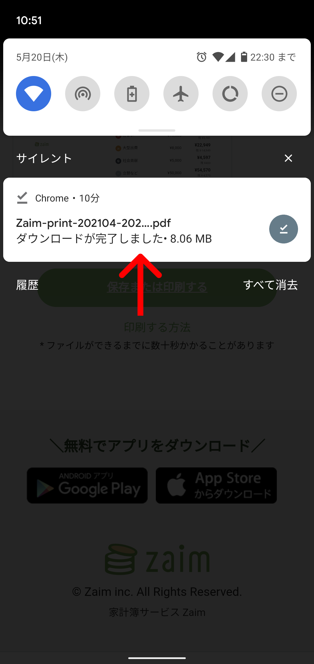 Android端末など一部環境下では、「保存または印刷する」をタップしたあと反応がないように見えますが、端末側にデータは保存されています。お手数ですが、端末内に保存されているかをご確認ください。