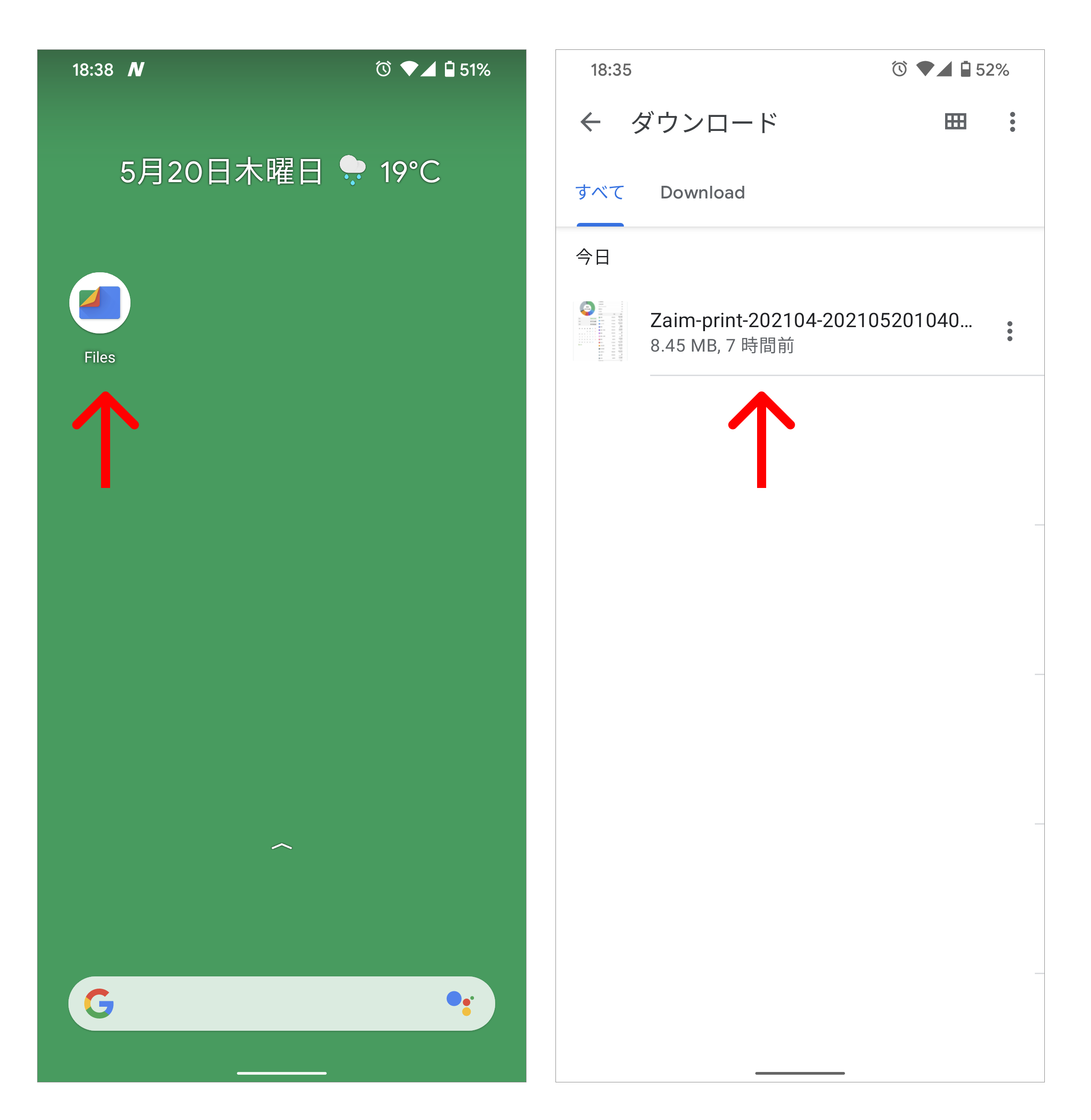 Zaim のアプリを閉じ、一覧から「Files」というアプリを選択します。メニューの「見る」から「ダウンロード」を選択すると、閲覧するファイルを選べるようになります。* 画面は 2021 年 5 月現在のものです